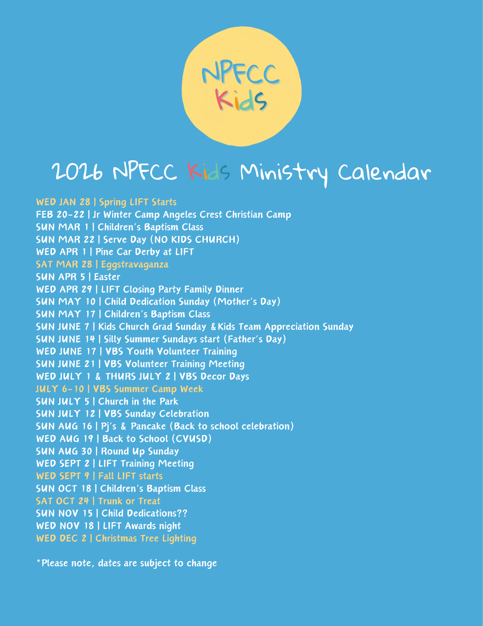 Print out our NPFCC Kids 2025 Calendar and save the dates for all your favorites! Please note a few dates are subject to change.